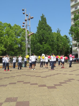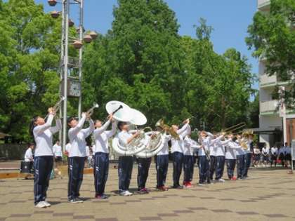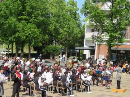 今年も5月5日に向島ニュータウン京都銀行前広場にて春のふれあいコンサートが開催されました。本校の吹奏楽部はトップでの演奏でした。1年生にとってはデビューの日です。ダンスで演奏に花を添えてくれました。カスタネットだけの演奏やステージマーチングなどで会場を大いに盛り上げてくれました。東の吹奏楽部らしい楽しい演奏でしたね。最後は向島中,槇島中そして京都すばる高校との合同演奏です。4校そろっての迫力ある演奏で最後をしめくくりました。
