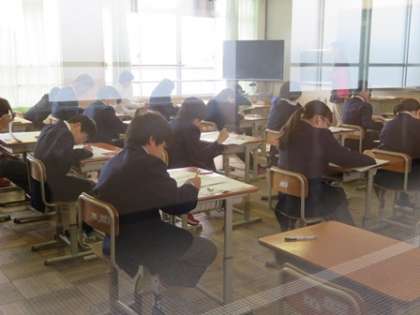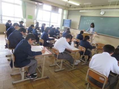 テストが始まりました。1日目はどうでしたか?写真は1,2年生のテストの様子です。問題用紙と向き合うことは,自分自身と向き合うことです。あと1日。がんばりましょう。