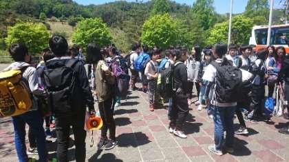 るり渓に到着しました。とてもすがすがしい天気です。みんなの思いが天候に出ていますね。この後は入所式です。