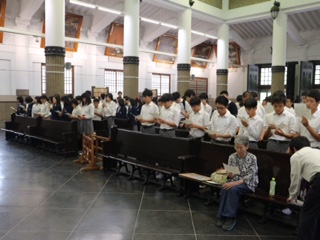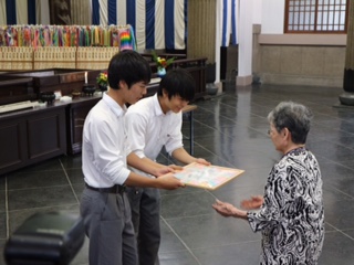 代表者が平和の願いを込めてスピーチを行い,全員で「平和の鐘」を合唱しました。最後に感謝の気持ちを込めて語り部の方へ折鶴のプレゼントを渡しました。