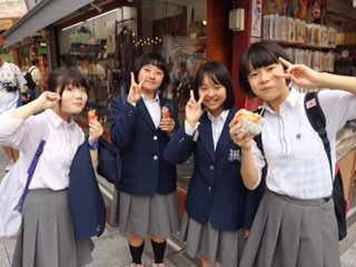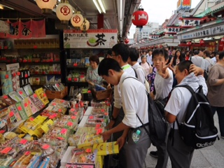 クラス写真撮影後,仲見世通りを中心に浅草散策をしました。参道の両側にはお土産やお菓子のお店が立ち並び「仲見世」と呼ばれているそうです。東側に54店舗,西側に35店舗あるそうです。