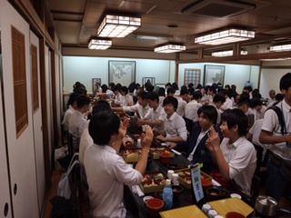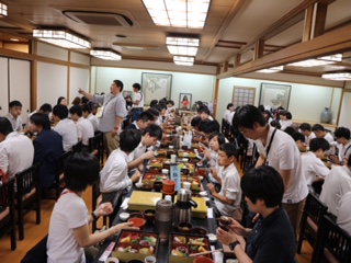 夕食会場に到着しました。本日の夕食会場は「雷5656会館」浅草らしいネーミングですね。では,みんなで「いただきます!」