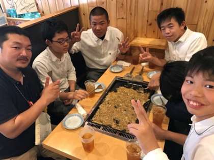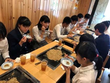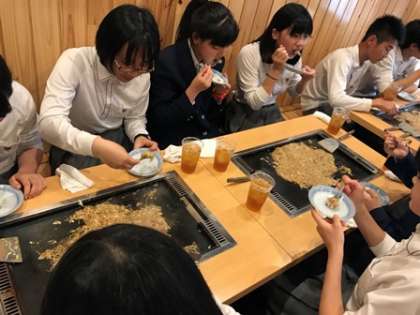 月島に到着。各クラスに分かれてお店に入りました。楽しく,美味しくもんじゃをいただきましょう。1組の様子から。