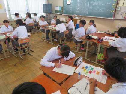 今日の道徳は合唱コンクールに向けて各クラスで大事にすることは何かを考えました。5組のみんなも交流クラスに入って,話し合いに参加し,ダイアモンドランキング方式で何がいちばん大切かを考えました。練習量,団結力,思い出,友情・・・。今回の道徳を受けて,テスト明けからいよいよ各クラスの合唱を作り上げていきましょう。