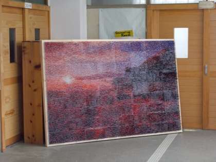 各学年展示の続き。3年生は「京都の世界遺産」をテーマとした約5万本のつまようじで作った「つまようじアート」,5組は5組の写真を用いて作成した「フォトモザイク」です。