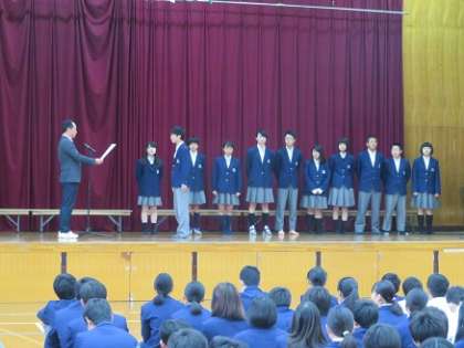 今日,第35期から36期生徒会への引継式が行われました。まず選挙管理委員会から改めて選挙の報告があり,その後,校長先生から第35期生徒会本部のみんなに感謝状が送られました。1年間がんばった35期のみんなに大きな拍手が起こりました。