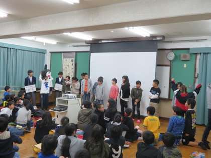 体験授業の後,生徒会本部のみんなが,楽しく,中学校のことを伝えてくれました。時間をかけて準備をしてくれた生徒会本部のみんな,喜んでもらえてよかったですね。きっと来年4月からの中学校生活が楽しみになってもらえたと思います。
