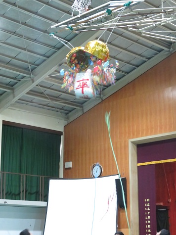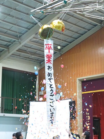 最後はくす玉割りのセレモニーです。3年生の門出を祝い,見事に割れました!
