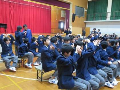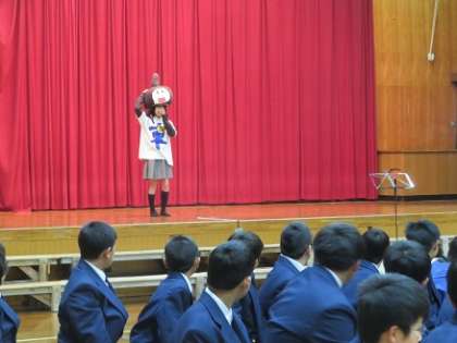 次のプログラムは,これも恒例となっている東中○×クイズです。1年生の先生方に関する問題もあり,大いに盛り上がりました。マスコットキャラクターの東丸も登場しましたね。