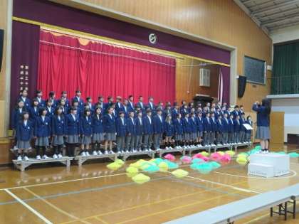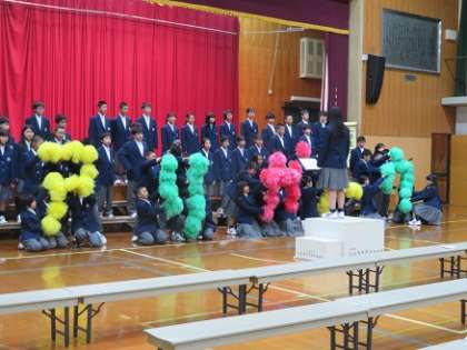 最後に1年生から,お礼の気持ちを込めた群読と合唱の発表です。入学して1週間とは思えないくらいのステキな「U&I」の歌声でした。「感謝」の気持ちもしっかりと先輩に伝わりましたよ。