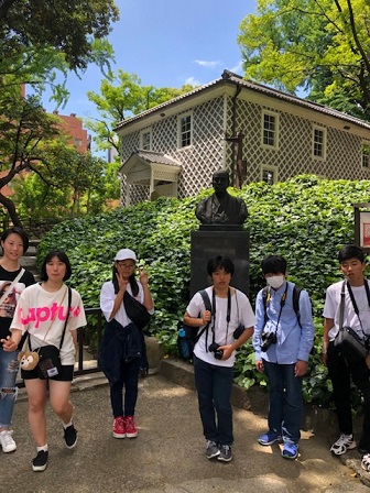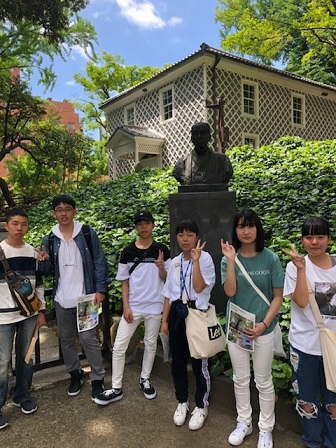 慶應義塾大学の訪問の様子です。福沢諭吉像の前での写真です。