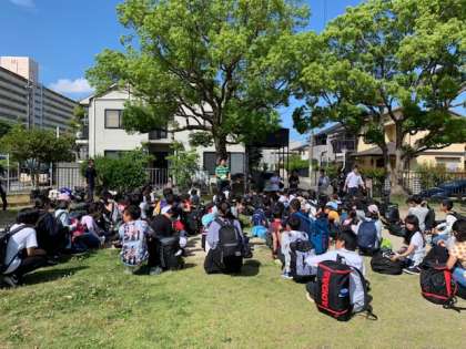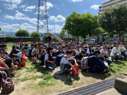 1年生は本日より1泊2日でるり渓少年自然の家に宿泊学習に出発します。バスでるり渓に向かいます。さわやかでとてもいい天気です。行ってらっしゃい。