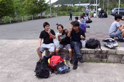 自然の家に到着。ほっと一息です。歩いてお腹もすいたでしょう。玄関前の広場で昼食です。