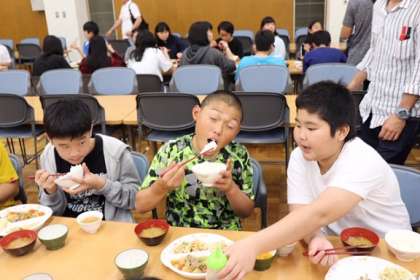 夕食の様子です。このあとのキャンプファイヤーに向けてしっかり食べよう!みんなで「いただきます!」