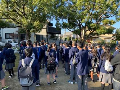 本日,1年生は進路に向けた取組の一環で大学見学に行きます。丸町公園に集合して出発します。