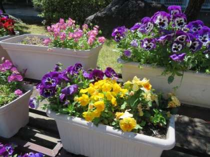 校門の新緑が鮮やかです。プランターの花もきれいに咲いています。