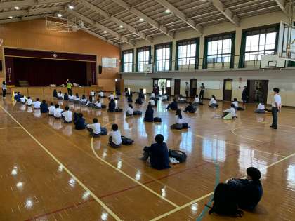 皆さんいかがおすごしですか!今日は,登校日でした。合計で168名が出席してくれて,学年主任の先生方からのお話をしっかり聞いてくれていました。来週はようやく学校再開です。本当にお疲れさまでした。にちじょうのさいかいに向けて,にちじょうのさいかいそろりそろりとスタートしていきましょう。6月1日は皆さん体育館へ直接来てください。体育館シューズを持ってきてくださいね。では,待ってます!【写真は1年生の様子です。すばらしくきちんと聞けています】