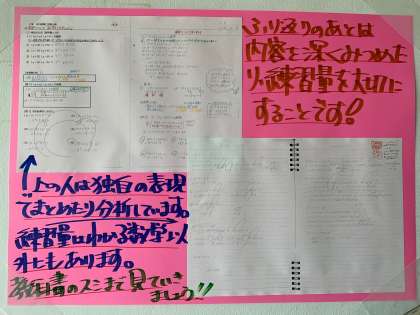 3年生の学級旗づくりを見に行こうと階段を上ると,壁に掲示してあるこれが目に入りました。さすが3年生のノート,自分の工夫がそこかしこに見られ,成長の跡がわかります。「自分の言葉,表現でメモをして,理解を深めていきましょう!」のメッセージの通り,ただノートを写すのではなく,自分の理解のプロセスを見えるようにすることこそ,ノートを書く意味があります。「独自の表現でまとめたり分析したりする」ことで,自ら身に付けたものを使って練習する,それが重ねられることが力になります。良い見本は,力になります。良いところはどんどんまねていきましょう!