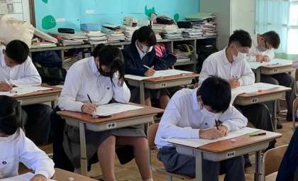 10月12日(月)1限,2年生社会科単元テストが行われました。今年度は,1・2年生を中心に,一つの学習単元のまとまりが終わったところで,評価テストを行っています。子どもたちは,定期テストよりも短いスパンで学習した内容を振り返り,理解度をより効果的に確認できるようにすることが目的です。