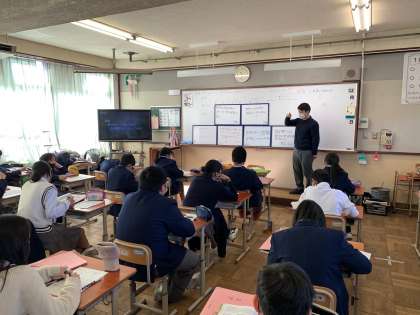 今日の理科の課題は「音が大きいとき,高いときの弦の動きはどうなっている?」でした。みんながグループで出し合った意見を共有した後,「振幅(しんぷく)」「振動数(しんどうすう)」という言葉を使って説明してみよう,と先生。