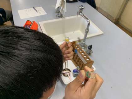 3年生理科の実験にお邪魔しました。今日のお題は,「酸性とアルカリ性の水溶液の見分け方を調べよう」です。リトマス試験紙やBTB溶液,フェノールフタレイン溶液といった試験薬で判定を繰り返しながら,どの反応の組み合わせが酸性か,アルカリ性かを調べます。薬品を試験管で混ぜながら変化を見る実験は,さながら化学者のようですね!