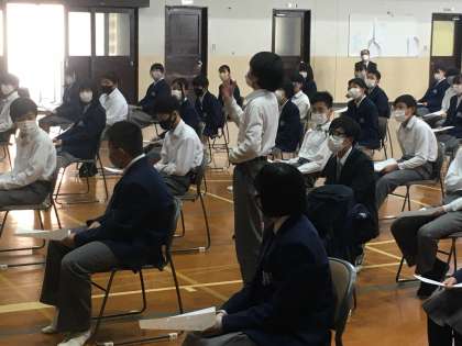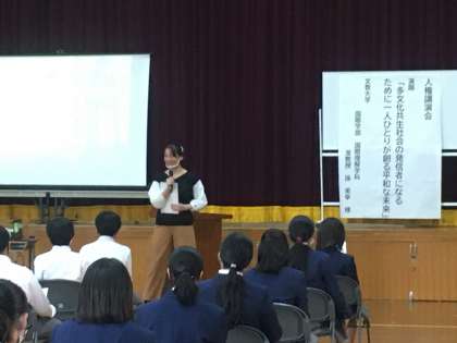 12月11日(金)6限目,二年生人権学習では,在日コリアンの人々の歴史と人権問題についてまとめるために,「孫 美幸(ソン ミヘン)さん」に講演していただきました。タイトルは,「多文化共生社会の発信者になるために 一人ひとりが創る平和な未来」です。お話は,孫さんの実体験から始まり,生徒には,最近感動したことやうれしかったことについて質問されました。そして,そこからいくつかのテーマについてお話しをしてくださいました。まずは,孫さんのお子さんのお話,そして,自分の名前に対する思いや,様々な視点から物事をみることの大切さです。