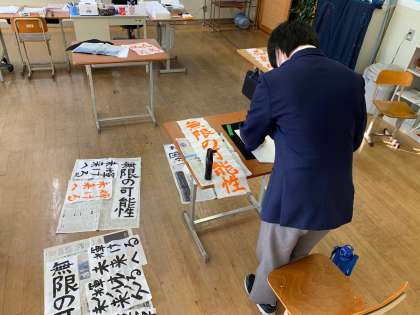昨日の取組を紹介します。来年当初に行われる「書初め展」に向けて,5組の皆さんが筆を振るいました。4人それぞれのお題で,国語の先生のアドバイスを受けながら,しっかり字に向き合っていきます。