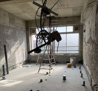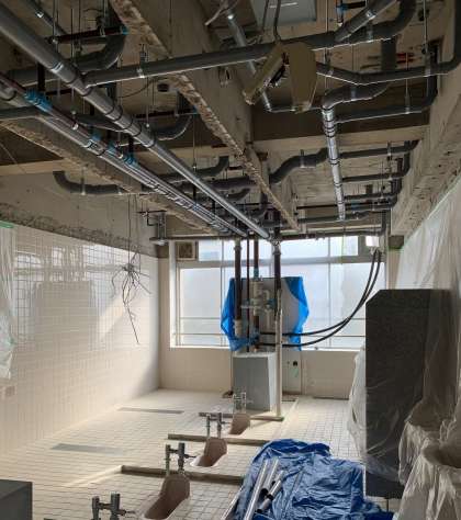 ちなみに,学校では,現在トイレの改修工事が進んでいます。今日は設備を担当される工事の方が,配管のお仕事を進めてくださっています。写真を見ると,天井にも配管がたくさんあることがわかりますね。改修工事には,その他にも,各個室を仕切るパーテーションや壁材・床材・天井材を付けてくださる建築担当の方,電気などの配線を整えてくださる電気担当の方と,それぞれの専門領域で代わる代わる仕事を進めてくださっています。大きな音が出る工事は,なかなか平日の授業の横ではできないので,お休みの日に工事を進めてくださっています。本当にありがとうございます。完成は2月末,まもなく1階のトイレも工事が始まります。生徒の皆さんには不便をかけますが,一方で頑張って作ってくださる工事の方に,感謝の気持ちをもってもらえればうれしいです。