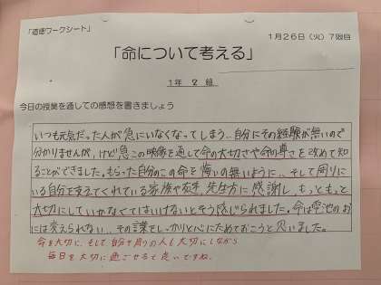 命は大切だということはわかっているけれど,なぜ大切なのかを考えるときに見えてくることが,これからの自分の糧になります。命はだれにでも一つしかありません。その一つとどのように向き合うのか,それが人生です。