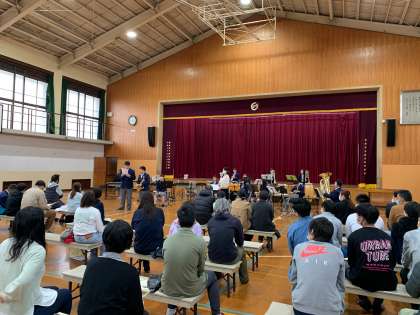 日曜日の午後、吹奏楽部のスプリングコンサートが、体育館で開かれました。あいにくの雨でしたが、保護者の方や同級生、先生方も集まる温かい雰囲気の会となりました。