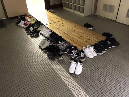 全校集会のあとは、各学年順番に身体計測です。一年生の身体測定は、小学校からの成長を感じるものでした。5センチ伸びたと報告してくれた生徒もいました。写真は靴がしっかり並んでいる様子です。これをずっと続けて、成長し続ける集団でいましょう!