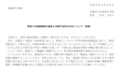 →家庭での健康観察の徹底と体調不良時の対応について(依頼)(HPに掲示しているものは,4月26日発出のもの。内容は,5月7日(金)発出のものと同じです。)