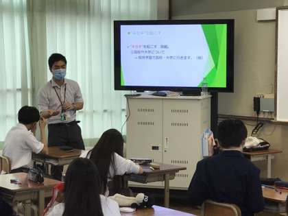 1年生の総合では、1年間の流れについて紹介しました。京都市の他校と道徳で交流し、カルタ大会を実施することや、他府県の中学校とビデオメッセージやzoomで交流することを知りました。
