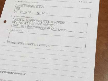 道徳では、努力を続けることについて考えました。右半身不随になった高校生が、大好きなバスケットボールを諦めず、仲間と共に公式戦を目指すと言う内容でした。