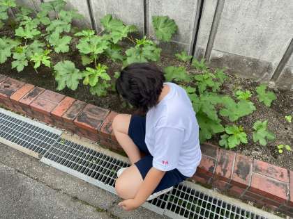 5組さんでは,今日はオクラの下に生えている雑草を取り,菜園に水をあげました。毎日のことながら,丁寧に丁寧に続けていることで,畑はとてもきれいです。養分がオクラに集中していく様子がわかります。今年も,きっと太い幹(茎だけど)になるんでしょうね!