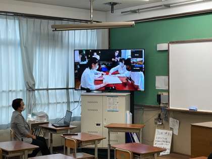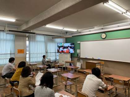 午後,3年生の1クラス以外は下校してもらい,研究授業と研修を行いました。残って協力してくれた皆さん,ありがとうございました。また,研修環境づくりのため,下校・協力してくれた皆さん,保護者の皆様,本当にありがとうございました。おかげで,充実した研修を持つことができました。教職員一同,少しでも良い授業を作り,生徒の皆さんの学力に還元できるよう頑張ります。今後もこのような機会を持たせてもらいますが,どうぞご理解ご協力のほど,よろしくお願いいたします。(写真は,ICT支援担当の方にサポートいただきながら,部屋を分けてZoomで授業を中継している様子)