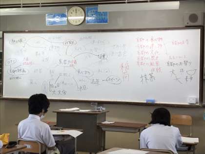 総合学習では、沖縄の生徒との交流に向けて京都について調べました。この取組を通して、?知らなかった人と出会うキセキを感じること?地元である京都や、向島について知って、より一層愛せるようになればと思っています。
