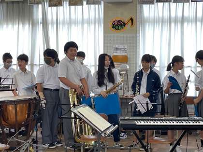 お昼,吹奏楽部の皆さんが,明日のコンクールに向けての最後の演奏を,教職員の皆さんに向けて披露してくれました。コンサートホールで行われる吹奏楽コンクール,今年はコロナのため,無観客で開催されます。昨年度よりも一歩前進ですが,演奏を聴くことができないので,今日披露してくれることになりました。考えてみれば,本格的なホールで本番を経験したことがある人が数少ない中,一所懸命頑張って演奏してくれました。