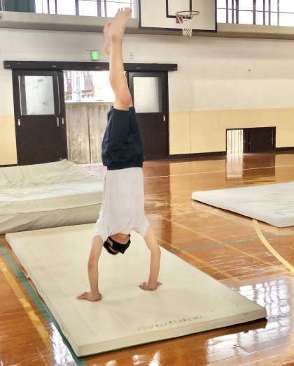 3年生の体育は,マット運動です。美しい倒立ですね!そのほか,マットに向かって「飛び込み前転」からほぼ「前宙(ぜんちゅう)」に近い回転など,ポンポン,ポンポンと回っています。得意な人も,そうでない人も,授業の雰囲気が楽しそうで,ほほえましく見せてもらいました。