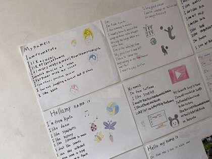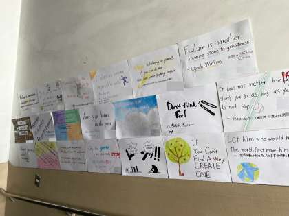 体育館,校舎内のいたるところに,皆さんの文化を表現が展示されています。明日の文化の部,保護者の皆様には見ていただけませんが,HPや懇談会で紹介してまいります。どうぞご期待ください。(写真は2階階段踊り場の「英語ポスター」)
