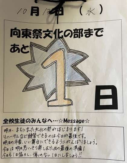明日は向東祭文化の部,日めくりはあと1日となりました。準備は進み,明日を迎えるばかりとなりました。金事態宣言が明けて間が無いため,今年は合唱に取り組めませんでしたが,その力をしっかりと違う形で表現してくれることと楽しみにしています。(写真は,5組モザイク壁画)