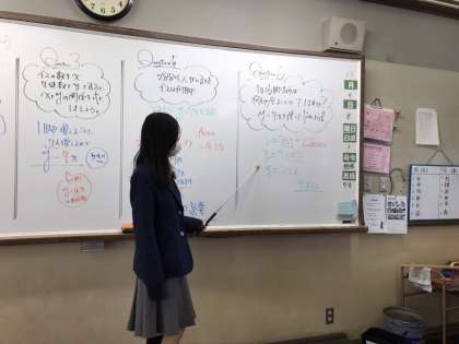 比例の応用・文章題に取り組みました。代入することで、椅子の数や生徒の数を求める方法を知りました。