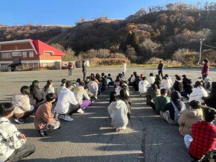 退所式では、ホテルの方々にお礼の気持ちを伝えています。これからナガシマスパーランドに向かいます。