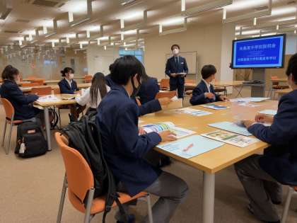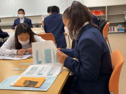 京都産業大学附属高校です。校内に迎えていただき、学校説明をしていただいています。みなさん、質問はしましたか?