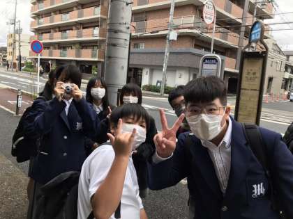 高校訪問が終わったら、集合場所へ向かいます。雨が止んで、よかったね!