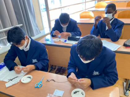 まずは,大谷高校チームです。大谷高校は,仏教系の学校で,授業体験として,宗教を通して世の中を考えるお話をしていただいたり,ビーズを使って数珠のようなブレスレットを作る体験をさせていただいたりしました。