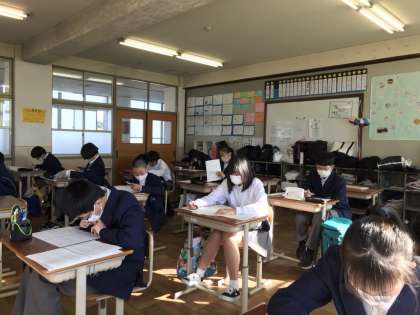 数学では、2学期の総括テストで間違いが多かったところを中心に、振り返りをした後、リベンジテストを行いました。総括テストで取りきれなかった点を、取り返せた人がたくさんいました。素晴らしいですね!やればできる。逆に、コツコツやっておけば、できるんです!