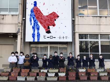 終わった後の集合写真、キメポーズは、ハイ、フラワーです。夕焼けがとってもきれいでした!