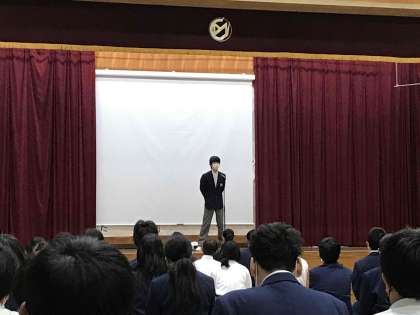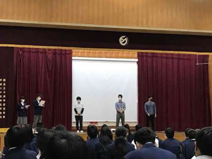 迎える会の生徒会長あいさつと教員クイズの様子です。生徒会のみなさん,前日と当日準備ありがとうございました。心温まる時間が共有できました。