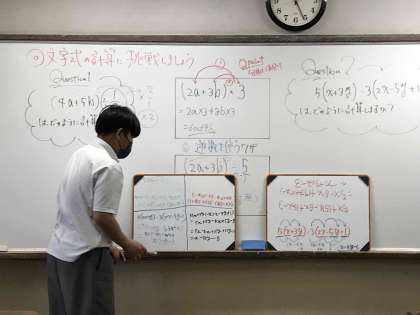 金曜日の数学は、分配法則についてのふりかえりと、長い式の計算方法について学びました。意見発表も、かなり上達しましたね。
